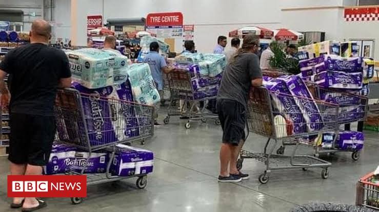 Março de 2020: começo da pandemia nos EUA, crise de desabastecimento nos supermercados. Milhares de americanos brigando por alimentos e papel higiênico para estocarem por emergência. Março terminou com um total de cem mil casos de Covid-19 nos EUA.