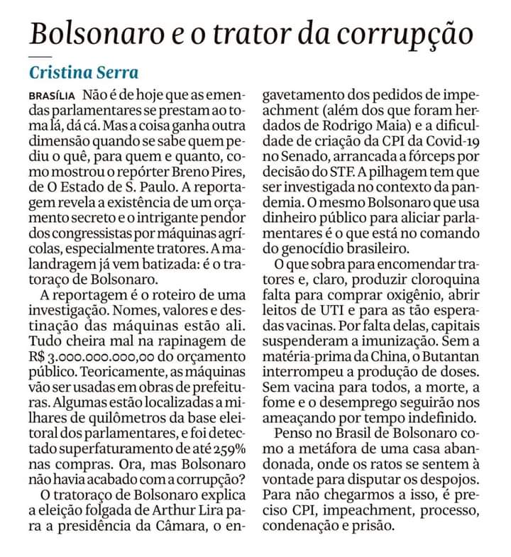 Ao mesmo tempo em que o governo miliciano diz não ter verba para vacina, para o ensino, para saúde e até para o combate à corrupção, com o sucateamento do COAF, o picareta distribuiu 3 bilhões de forma secreta para parlamentares aliados, os quais serviram inclusive para compra de tratores por valor 250% maior que o preço comum.
